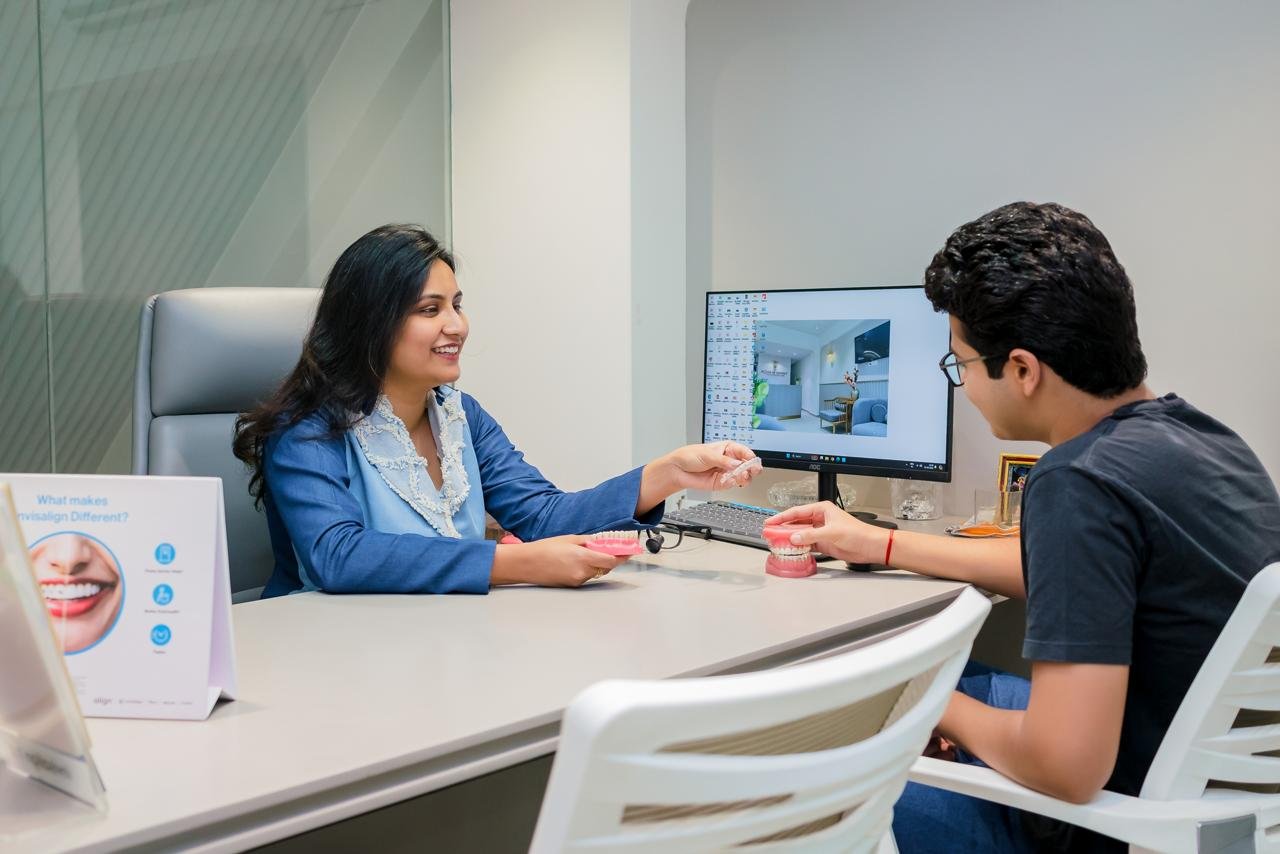 Invisalign is a modern orthodontic treatment that uses a series of custom-made, removable, and nearly invisible clear plastic aligners to gradually straighten teeth without the use of metal wires or brackets. Designed for both teens and adults, these aligners are typically worn for 20–22 hours a day, offering a comfortable, discreet, and flexible alternative to traditional braces. Clear aligner (invisible braces) treatment works by using a sequence of specially designed aligners that gently move teeth into their desired positions over time. Each aligner is custom-made for the patient and is usually replaced every one to two weeks to continue the alignment process. Clear aligners are widely preferred for their aesthetic appeal, enhanced comfort, and removable design, which makes eating, brushing, and maintaining oral hygiene much easier throughout the treatment.